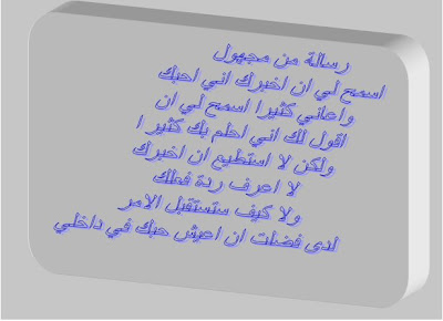 رسالة الى مجهول يا صديق.... انا كتلة من الاحاسيس حولتها الحياة الى شعلة من الدمار انا عاصفة هوجاء حطمتها صخور الحقيقة انا سماء صافية لبدتها غيوم الحزن والجنون لتتنتج منها مدينة للقهر |