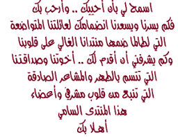 نُصَافِحَكُم و الْحُب اكْفَنَا .. لِنَهْدِيكُم أَجْمَل مَعَانِيْنَا وَنَعْزِف مِن هَمْس الْكَّلَام أَعْذَبَه .. و مَن قَوَافِي الْقَصِيد أَجْزَلِه لـ نَحْظَى بـ مَرَاسِي الْفِكَر و الَقَلَم http://smiles.al-wed.com/smiles/72/mo52.gifhttp://smiles.al-wed.com/smiles/72/mo52.gifhttp://smiles.al-wed.com/smiles/72/mo52.gif نَفْرِش لَك بِسَاط الْقُلُوْب فااسْكّن بِسَلَام وَانْثُر عَبَق الْوُرُود بِمَقْدَمِك وَجِئْت تِقّن الْضَّوْء بِحُضُوْرِك فـــشُكْرَا لِاخْتِيَارِك مُنْتَدَانَا وَلْقَبُوْلك الانْضِمَام لِهَذَا الْصَرْح الْخَيَالِي http://smiles.al-wed.com/smiles/72/mo51.gifhttp://smiles.al-wed.com/smiles/72/mo51.gifhttp://smiles.al-wed.com/smiles/72/mo51.gif طَاب وَثِيْر http://smiles.al-wed.com/smiles/72/mo39.gifال بنات فلسطينhttp://smiles.al-wed.com/smiles/72/mo39.gif بِقُدُوْمِك فَأَهَلَّآ بِك بَيْنَنَا عُضْوَ بَاذِخ الْطَلَّة مُتَشَوْقُيْن لِبُزُوّغ قَلَمِك بَيْن نُخَبَتِنا ..كُل الْأُمْنِيَات بِالِاسْتِقْرَار هُنَا http://smiles.al-wed.com/smiles/13/129.gifhttp://smiles.al-wed.com/smiles/72/mo32.gifhttp://smiles.al-wed.com/smiles/13/129.gif وَبِانْتِظَار مَا تُقَدِّمُه لَنَا مَن شَهِد الْحُرُوْف مَوَدَّتِي وَجُل تَقْدِيْرِي.. شذي |